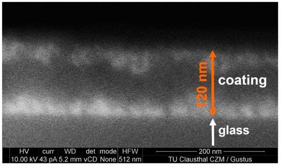 Due to this three-layered architecture the intended coating properties—antireflectivity and photocatalytic activity—are supported by different mechanisms. Generally, the combination of interference layers with a high refractive index for the first layer and a low refractive index for the second layer results in high antireflective properties. Depending on coating thickness, a third high refractive layer can broaden or sharpen the transmittance maximum. Regarding to SNMS (Figure 5) and FESEM (Figure 7), the top layer of sample 17–83 seems to be smaller, and it seems to contain less ceria than the layer at the interface to the glass substrate, which can explain the evolution of the transmittance curve in Figure 1. Compared to sample 10–90, whose ceria depth profile shows no double peak, the transmittance maximum is increased to between 450 and 1000 nm, but decreased for higher and lower wavelengths. Such a wavelength dependence is typical for interference multilayers. As to be expected, and with respect to the ceria concentration, the solar transmittance of sample 17–83 is lower than that of sample 10–90.