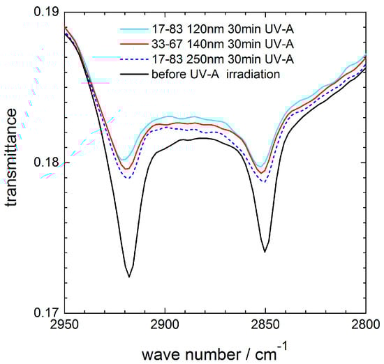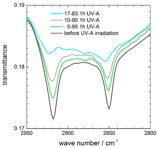 Figure 8 and Figure 9 show the characteristic absorption bands of the CH2-stretching modes at 2853 and 2923 cm−1 of a stearic acid film on a ceria-containing coating before and after UV-A irradiation. Figure 8 compares the stearic acid degradation during 1 h of UV-A irradiation of the 5–95, 10–90, and 17–83 coating. An increase in the photocatalytic activity with increasing ceria content is evident. In particular, the 17–83 coating nearly completely degrades the stearic acid film during 1 h of UV-A irradiation, while the 10–90 coating reduces the IR peaks to approximately half. For the 5–95 coating, the stearic acid degradation is lower, but clearly visible if one compares the bands with their heights before UV-A irradiation.
