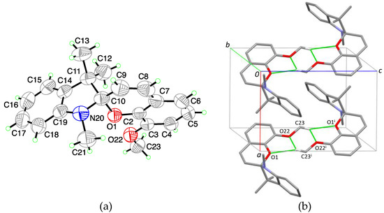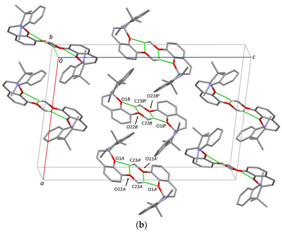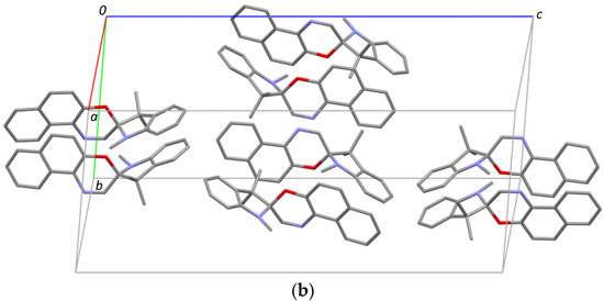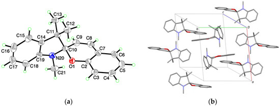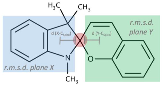 Appendix Table A1). Furthermore, in all cases, the indoline heterocycle plane (excluding the central chiral center C10) shows the arrangement of a flattened envelope with a distance of approximately 0.4 Å to the chiral center C10. The chromene plane (excluding the C10 atom) makes an angle with respect to the first plane. All angles can be found in a 13° range from one another. A strict overlay of the indoline heterocycles in all five crystal structures (