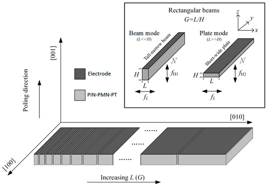 Figure 1 illustrates the crystallographic orientation and poling direction of an as-prepared PIN–PMN–PT rectangular plate with 0.33:0.35:0.32 PIN:PMN:PT ratio, together with its rectangular beams having the same length N (=13.0 mm) and height H (=0.35 mm) but with different widths L (=0.14–4.90 mm) and hence different width-to-height ratios G (=L/H = 0.4–14.0). Each rectangular beam has its L, N, and H aligned along the x-, y-, and z-axes, respectively, as well as its poling direction oriented in the [001] direction along the z-axis. Details of the preparation of the [001]-poled PIN–PMN–PT rectangular plate and its [001]-poled rectangular beams are provided in Section 3.1. These rectangular beams are very long (i.e., N >> L and H) so that the operational modes in the megahertz frequency range are mainly determined by the dimensions (i.e., L and H) of the rectangular cross-section and can be classified into three main types as follows.