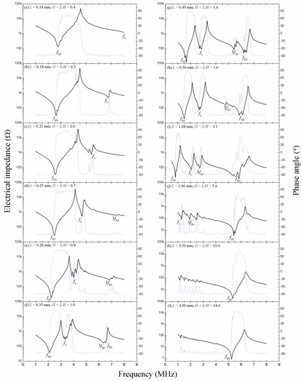 Figure 2 shows the measured electrical impedance and phase angle spectra of the PIN–PMN–PT rectangular beams with different L of 0.14–4.90 mm and different G of 0.4–14.0. When G is small (e.g., G = 0.4–0.7 in Figure 2a–d) such that the rectangular beams behave tall-narrow beams, the strongest resonance that appears quite steadily at the low frequency of ~2.5 MHz is the beam mode fH1, while the much weaker resonance that occurs initially at ~8 MHz (Figure 2a) shifts to the low-frequency side, and then couples with fH1 as a result of an increase in L (Figure 2b–d) is the lateral mode fL. This G range of <0.7 (Figure 2a–d) is preferable to develop single-frequency ultrasonic array transducers operating in uncoupled beam mode. When G is >0.7 (e.g., G = 0.8 in Figure 2e), fL starts to couple with fH1. By elevating G to 1.0–5.6 (Figure 2f–j), fL further decreases and couples with fH1, while the plate mode fH2 emerges and becomes the dominant mode at ~6.0 MHz. This highly coupled G range of 0.7–6.0 is unsuitable for single-frequency ultrasonic array transducer applications, but is capable of realizing multifrequency ultrasonic array transducers. It is interesting to note that the third harmonic of fH1 is detected and labeled as 3fH1. The even harmonics are not expected to be observed because the applied electric field has opposite polarities on the two electrode faces of the rectangular beams. By increasing G to >6.0 (e.g., G = 10.0 in Figure 2k and G = 14.0 in Figure 2l), fH1 becomes weakened and eventually negligible, while fL down-shifts to a frequency far below fH2. This G range of >6.0 (Figure 2k,l) gives a strong and clear fH2 at ~5.3 MHz and is desirable for fabricating single-frequency ultrasonic array transducers working in uncoupled plate mode.