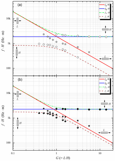 Frequency constants (f·H) of PIN–PMN–PT rectangular beams as a function of G for (a) short-circuit (E) condition based on series resonance frequency fs and (b) open-circuit (D) condition based on parallel resonance frequency fp. The lines represent the mode-coupling predictions, while the symbols indicate the observed fH1, fL, and fH2 in Figure 2.