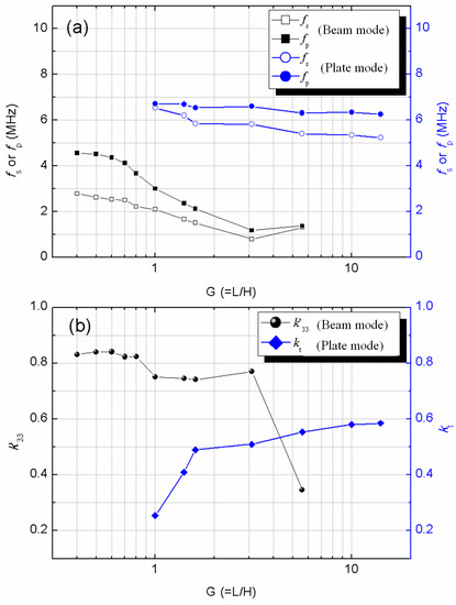 Figure 4a shows the G dependence of the measured series resonance frequency fs and parallel resonance frequency fp for the beam mode (i.e., fH1) and the plate mode (i.e., fH2) in Figure 2. It is obvious that fs and fp of the beam mode drop slightly from 2.75 to 2.54 MHz and from 4.64 to 4.08 MHz, respectively, when G is increased from 0.4 to 0.7. After that, they drop rapidly and tend to merge with each other at ~1 MHz. For the plate mode, fs and fp separate gradually with increasing G from 1.0 to 5.6. They then remain relatively stable. Figure 4b gives the G dependence of the measured electromechanical coupling coefficient for the beam mode (k’33) and the plate mode (kt). For G ≤ 0.8, k’33 is as high as ~0.84, while kt is neglectable. At an elevated G of 0.8–5.6, there is an obvious drop in k’33 to ~0.75 and an emergence and increase in kt to ~0.50. When G is further elevated to 5.6, k’33 drops to ~0.35, while rises to ~0.56. Besides, a strong mode-coupling region is found in the G range of 1.6 to 3.1, in which both beam mode and plate mode coexist strongly and the corresponding electromechanical coefficients are ~0.75 and ~0.50, respectively.