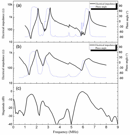 (a) Electrical impedance and phase angle spectra of a PIN–PMN–PT rectangular beam with G = 1.6 and operating in coupled/coexistent beam mode, lateral mode, and plate mode; (b) electrical impedance and phase angle spectra of the resulting multifrequency ultrasonic array transducer; (c) pulse-echo response spectrum of the multifrequency ultrasonic array transducer in (b).