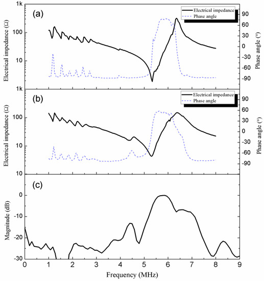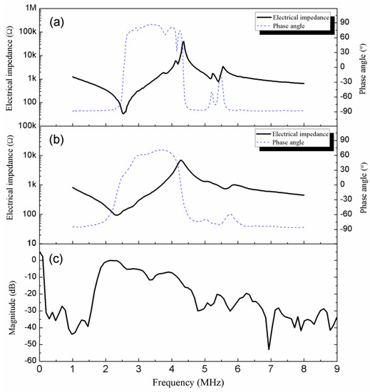 (a) Electrical impedance and phase angle spectra of a PIN–PMN–PT rectangular beam with G = 10.0 and operating in uncoupled plate mode; (b) electrical impedance and phase angle spectra of the resulting plate-mode single-frequency ultrasonic array transducer; (c) pulse-echo response spectrum of the plate-mode single-frequency ultrasonic array transducer in (b).