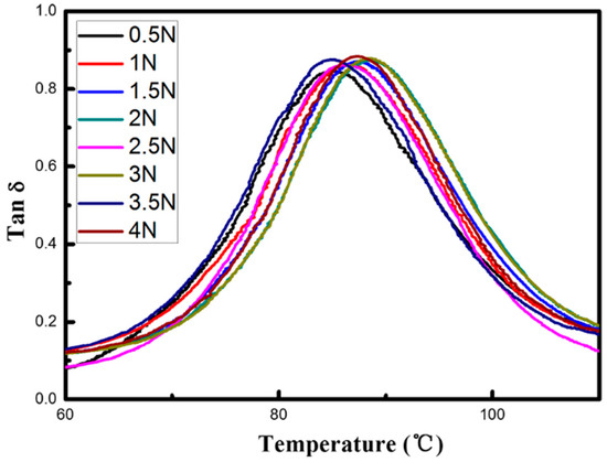 The composites behavior shown with different loading force is not like that of a conventional viscoelastic body [23]. When samples were with the preload force, the bond length and bond-angle of epoxy polymer’s molecular chain would change as a tensioning process, which would cause an obstacle to the deformation of the composites. The deformable parts in the matrix become smaller while the preload force increases. On the other hand, when the preload force raises, the piezoelectric effect and the interface friction would enhance, causing an increase in the maximum loss factor. Tg and effective temperature region mostly depended on the chain segment movement of epoxy so the peaks in tanδ curves shift slightly to the right side. We can speculate that the piezoelectric effect and interfacial friction mainly contribute to composites’ damping properties when the piezoelectric ceramic volume fraction exceeds 0.2. The damping capacity was enhanced by piezo-damping as the piezoelectric effect enlarged in the piezoelectric ceramic when the loading force increased. However, the changing range was lower.