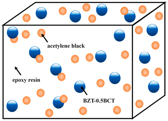 The epoxy resin matrix (E-51) used in this research was provided by Wuxi Xinmeng Co. Ltd. (Wuxi, China) and acetylene black powders were provided by Taiyuan Yingze battery sales department (Taiyuan, China). To improve the surface lipophilic, BZT-0.5BCT powders were firstly treated by silane coupling agents and absolute alcohol. Conductive acetylene black was added into epoxy resin and mixed, then the pretreated piezoelectric powders and curing agents were added and stirred thoroughly under vacuum. The homogeneous viscous mixture was poured into a mold and solidified at 80 °C for 2 h. The BZT-0.5BCT/acetylene black/epoxy composite was obtained when cuing finished. The composite was cut, and poled. The three different composites fabricated contain 2 wt % acetylene black and 20, 40 and 60 vol % piezoelectric powders, respectively. Five 20 mm × 3 mm × 2 mm samples were fabricated for dynamic mechanical analysis.