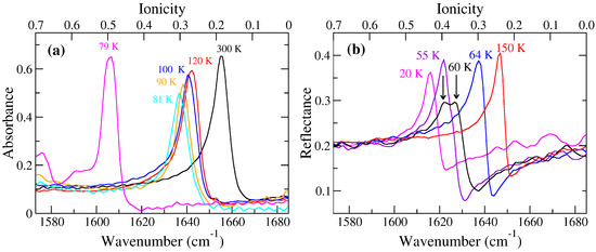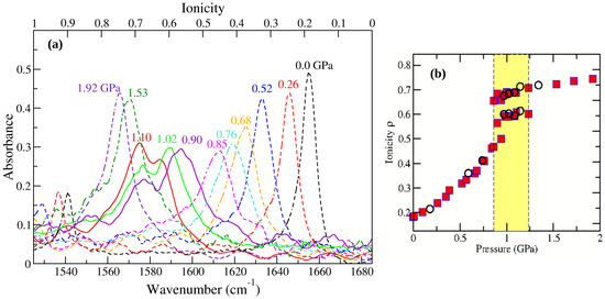 Vibrational spectroscopy, and infrared (IR) spectroscopy in particular, offers basic information on NIT. In fact, the ionicity can be estimated by looking at selected intra-molecular charge-sensitive vibrations, whose frequencies depend linearly on [21,22]. In the case of ms crystals, however, totally symmetric modes cannot be used, as their frequency is perturbed by the interaction with the CT electron (electron-molecular vibration, e-mv, interaction) [21,23]. In the case of ms CT crystals involving chloranil, the C=O antisymmetric stretching is the most apt charge sensitive mode, in virtue of its large ionization frequency shift (160 cm) and of its occurrence in a spectral interval (1685–1525 cm) relatively free from interference from other vibrational modes [24].