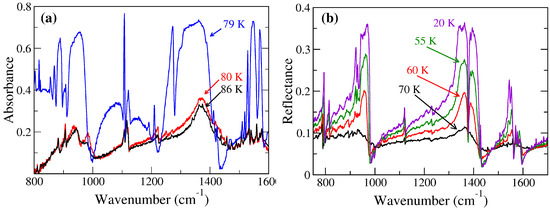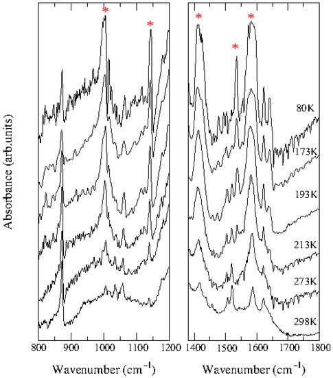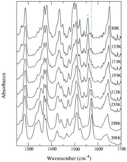 In Figure 18 we report the temperature evolution of IR absorption spectra in the 800–1200 and 1380–1800 cm, polarized along the stack. The e-mv induced bands due to totally symmetric modes are immediately recognized since they gain IR intensity by lowering the temperature, and also have their counterpart at the same frequency in the Raman spectra (not shown). The principal ones are marked by a red asterisk in the Figure. We notice that at room temperature the e-mv induced bands are already developed to some extent. This residual IR intensity of the totally symmetric modes (about 10% of the low temperature value) puts in evidence that there is already some degree of stack distortion at 300 K. The residual IR intensity decreases further by increasing the temperature up to ∼320 K.
