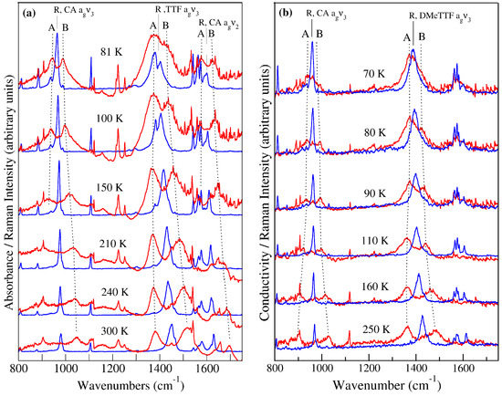 Comparison of Raman (blue line) and IR spectra polarized parallel to the stack (red line) for (a) TTF–CA [30] and (b) DMeTTF–CA [17]. The dotted line is a visual aid to follow the temperature evolution of A and B IR “sidebands” discussed in the text. The corresponding Raman bands are labeled by R and the assignment is reported on top.