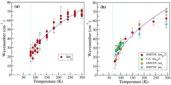 Temperature evolution of the frequency of the effective soft mode as derived from the frequency of the A and B sidebands (see text and Figure 4). The dashed blue line is the best fit of the experimental points with the curve . Panel (a): TTF–CA, from [30]; Panel (b): DMeTTF–CA, from [17].