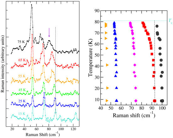 Temperature dependence of the low-frequency Raman spectra of the low-temperature, quasi-ionic phase of TTF–CA, showing the softening of the mode around 90–80 cm (marked by an arrow) as K is approached from below. The temperature evolution of the peak frequencies of the main Raman bands is reported on the right panel.