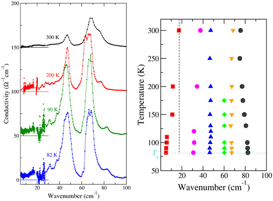 Temperature dependence of the frequency of the six lowest frequency Peierls coupled phonons, after the fitting to reflectivity spectra. For 300, 250, 200, 150, 110, and 82 K the calculated individual Lorentzian bandshapes are also shown. The green squares connected by a dotted line indicate the frequency of the effective Peierls mode, calculated by Equation (7) (From [32]).