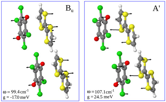 where is the CT integral between adjacent DA molecules along the stack, and is the reference normal coordinate for the i-th phonon with frequency and wavevector . The CT integral and its variation with is calculated by the extended Hückel method [31]. As an example of the involved phonons, Figure 8 shows the eigenvectors of two strongly coupled reference phonons of neutral (, right panel) and ionic (, left panel) TTF–CA, calculated at 99.4 and 107.1 cm, respectively. The phonon, as expected [25], implies an in-phase (ferroelectric) D-A oscillation along the two stacks in the unit cell. The phonon, on the other hand, also involves a rotational motion of the two molecules.