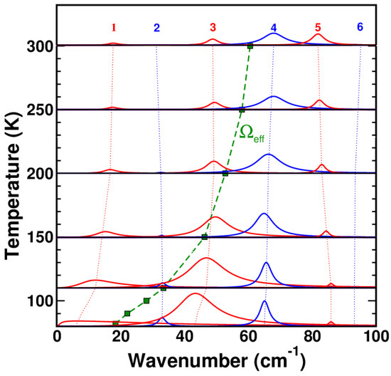 where are the T-independent reference normal coordinate, and are the eigenvectors obtained by diagonalizing the force constant matrix in Equation (2) with the calibrated T-dependent . A T-dependent effective coupling constant can then be assigned to each normal mode of the coupled system: