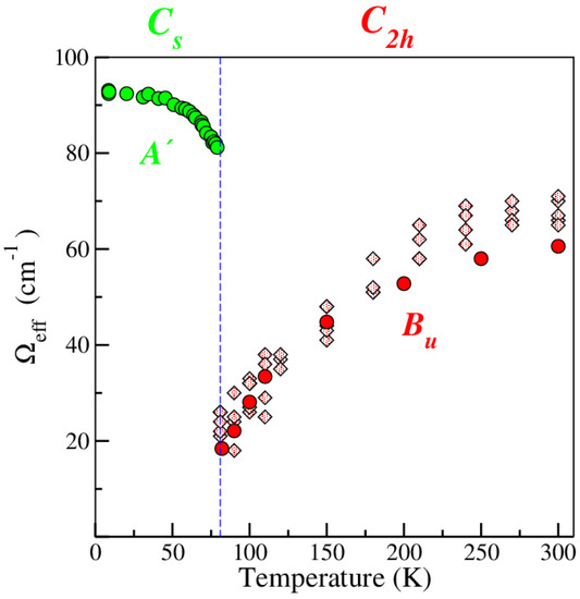 In Figure 9 the frequency obtained from Equation 7 (green squares connected by a dashed line), is superimposed to the frequencies of the six phonons below 100 cm. It is seen that follows the softening and the shift of spectral weight described by the Figure. The comparison of the computed with the frequency obtained from the analysis of combination bands in the mid-IR region is shown on the right side of Figure 10. The agreement between these two totally independent set of data is impressive, and strongly supports the interpretation of the spectroscopic data in terms of a soft mode. In the left side of the Figure we report, for completeness, the softening of the phonon around 80–90 cm of TTF–CA ionic phase. Calculations analogous to those just described for the neutral phase show that several phonons are coupled to the electronic system also on the ionic side [34], but that for the limited T and interval the transfer of the coupling strength to lower frequency phonons is not appreciable. Therefore in this case the single phonon coincides with the effective Peierls phonon.