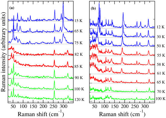 Temperature evolution of the low-frequency Raman spectra of TTF–CA (panel (a)) and DMTTF–CA (panel (b)) , measured with incident and scattered light polarized along the stack axis. The spectra drawn in red are those collected in the proximity of the phase transition, where the low-frequency background increase is evident.