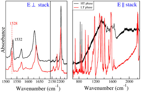 IR absorption spectra of TMB–TCNQ polarized perpendicularly and parallel to the stack axis, above (HT) and (LT) below the phase transition. From [19].