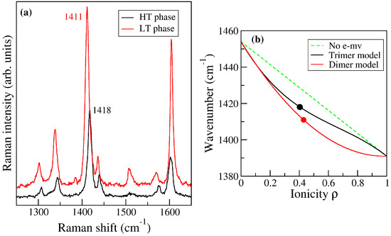 The Raman active totally symmetric modes are coupled to delocalized electrons [21,22], and in mixed stack crystals the linear dependence of their frequency from is lost. Nevertheless, a rough estimate of can be obtained by taking into account the perturbing effect of e-mv interaction through an appropriate model. The (a) panel of Figure 15 shows that in TMB–TCNQ the TCNQ mode shifts from 1418 to 1411 cm at the phase transition. For a regular chain like room-temperature TMB–TCNQ we can use the trimer model to estimate , and by disregarding the interaction among e-mv coupled modes (isolated band approximation), the perturbed frequency is given by [49]: