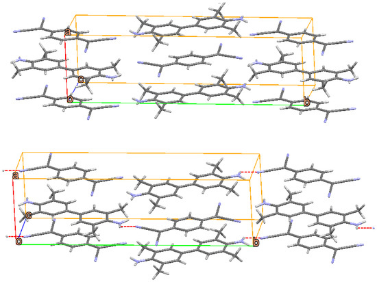 At room temperature TMB–TCNQ crystallizes in the monoclinic system, (), Z = 2, like TTF–CA. The stack dimerizes at the phase transition, and a minimum loss of symmetry implies the passage from a factor group to a either a group, like TTF–CA [25], or to a group. Structural data of the low-temperature phase are hard to get, because the sample cracks or breaks, and the occurrence of the transition and its critical temperature are scarcely reproducible [47]. Also simple grinding of the crystal may prevent the transition down to 77 K. Therefore a computational approach has been adopted to get some hint about the type of interaction triggering the transition and the associated mechanism [19]. In this particular case, a semi-empirical calculation, MOPAC16 with PM7 parametrization has been chosen, showing that the equilibrium geometry at 0 K belongs to the monoclinic () space group. A comparison of the cell structure of the experimental high temperature phase and of the computed low temperature phase is given in Figure 16.
