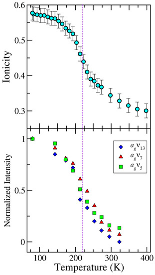 The detailed evolution of the intensity enhancement of the e-mv induced bands has been followed picking up the bands around 1006, 1417 and 1587 cm, corresponding to the DMeDCNQI modes [20]. Such T evolution of the e-mv induced bands, with normalization to the 80 K value, is compared with the corresponding evolution of in Figure 19. The ioniciy changes continuously with T, and the intensity of the e-mv induced IR bands, which is related to stack distortion, has the same S-shape as the variation. The stack is already dimerized to some extent at room temperature, when = 0.34. The point of maximum slope occurs in both cases around 220 K (violet dotted line in the top panel of Figure 19), whereas the conventional borderline of = 0.5 occurs at 200 K. If changes continuously the N-I borderline is ill-defined, but in any case the dimerization has started when the compound is still well into the neutral phase. Thus the dimerization represents the order parameter of transition, and the driving force appears to be the e-ph coupling. Since the variation does not imply a symmetry change, we can equate the NI interface to the gas-liquid one, where we have a critical point beyond which there is no phase boundary. Then for ClMePD–DMeDCNQI the data suggest that we are beyond the critical point: the interface is continuous and is not an order parameter.