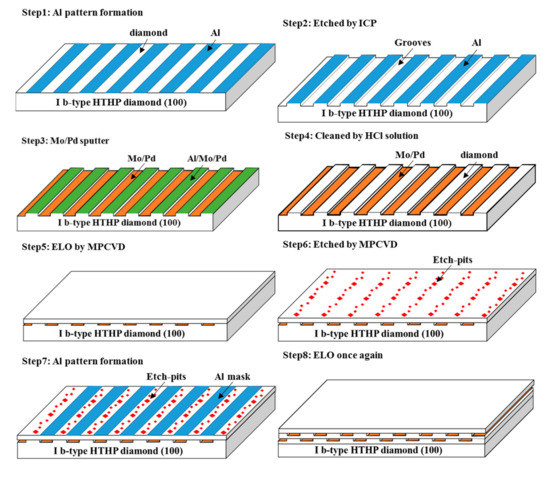 Two-step ELO on an HPHT diamond (100) substrate by MPCVD was used to fabricate a low dislocation density, single-crystalline diamond. Grooves were fabricated by ICP etching on the diamond surface, followed by sputtering Mo/Pd stripes in the grooves. Metal stripes were used to inhibit the propagation of dislocations originating from the diamond substrate by suppressing the vertical growth of diamond on the metal stripes. Plasma etching was used to characterize the quality of the epitaxial films and distinguish different growth areas.