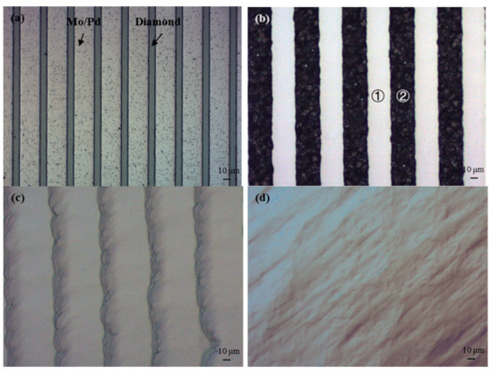Figure 2 shows optical images taken during the first ELO step. Figure 2a shows the image of the substrate after ultrasonic cleaning with an HCl solution. The grooves are covered with Mo/Pd layers, and the remaining areas are diamond windows. Figure 2b shows an image of the sample after 40 min of MPCVD growth. It can be observed that the diamond windows broadened from 10 μm to 25 μm by lateral overgrowth, as indicated in Area ①. Meanwhile, amorphous carbon formed on the Mo/Pd layers in the grooves, as indicated in Area ②. Figure 2c shows an image of the sample after 80 min of MPCVD growth. It can be observed that the diamond windows connected to form a continuous film. As the lateral overgrowth rate of diamond is much higher than the rate of amorphous carbon formation, the amorphous carbon was completely covered by diamond. However, the surface of the diamond film is not flat but instead has obvious stripes. Figure 2d shows the image of the sample after 240 min of MPCVD growth. It can be observed that the surface of the diamond film became smooth and flat.