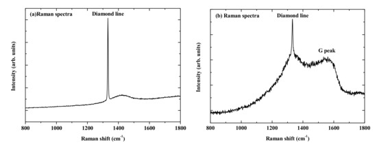 Figure 3a,b show the Raman spectra obtained from two different areas, ① and ②, as indicated in Figure 2b. The Raman excitation wavelength was 532 nm. For Area ②, both the first-order diamond Raman line (located at 1332 cm−1) and the sp2 amorphous carbon peak (located at 1520–1580 cm−1) can be observed. This suggests that amorphous carbon was first formed on the Mo/Pd stripes. In the spectrum of Area ①, the sp2 amorphous carbon peak is no longer observed. Meanwhile, the full width at half maximum (FWHM) of the diamond Raman line is much smaller. A peak located at 1430–1470 cm−1 appears in the Raman spectrum, which is related to the photoluminescence of CVD diamond.