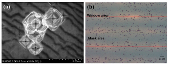 Although X-ray topography, cathodoluminescence and transmission electron microscopy can be used to observe and quantify dislocations in diamond, these methods are relatively difficult to apply since they require complicated sample preparation or heavy equipment [13,14,15]. Moreover, it is very difficult to distinguish areas of different growth quality for the purpose of fabricating a metal mask by the ELO process, since the differences can be seen only under the observation of heavy equipment. Since lattice defects, such as vacancies, dislocations, and impurities, serve as preferential sites for etching, plasma etching treatment can be used to characterize and distinguish different growth areas by dislocation density [6]. As etch-pits are formed after plasma etching treatment, it is quite convenient to assess the growth quality in different areas. In addition, the etch-pits, which can be observed under optical microscopy, can be used as markers for pattern alignment in the subsequent ELO process.