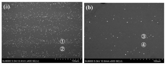 Figure 5 shows FE-SEM images of the first and second ELO layer after plasma etching for 15 min. As seen in Figure 5a, the etch-pits are distributed in stripes on the surface of the first ELO layer. Dislocations originating from the substrate windows propagate to the surface, which cause dense etch-pit formation upon plasma etching. By contrast, the dislocations were effectively blocked from propagating in the lateral overgrowth area. Thus, the etch-pit density was clearly lower in these areas. As seen in Figure 5b, the etch-pits distributed in the stripes can still be observed on the surface of the second ELO layer, but the density clearly decreased. Because the dislocation density on the diamond windows decreased, fewer dislocations propagated to the surface to form etch-pits after the second ELO step. Thus, after two steps of ELO, the quality of the CVD diamond film was improved by reducing the dislocation density.