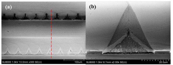 Figure 6 shows FE-SEM images of the cross section of the sample after two steps of ELO. In the second ELO step, the diamond windows were located on top of the Mo/Pd stripes, leading to low dislocation density, as indicated by the dashed line. As seen in Figure 6, dark-colored triangular areas appear on the Mo/Pd stripes, which are related to amorphous carbon. A small hole and a vertical borderline can be clearly observed, which are formed when the two growth fronts of diamond coalesce. The results are in accordance with Figure 2. Initially, amorphous carbon formed on the Mo/Pd layers in the grooves. Then, the diamond windows were connected to form a continuous film by ELO.
