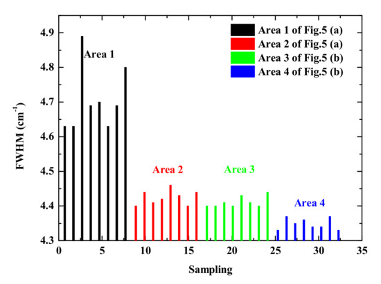 Figure 7 shows the FWHMs of the diamond Raman lines obtained from the different surface areas after ELO, as indicated in Figure 5a,b. After the first ELO step, the FWHMs obtained from dense etch-pit Area ① ranged from 4.62 to 4.89 cm−1. By contrast, the FWHMs obtained from the sparse etch-pit Area ② were all approximately 4.42 cm−1. This indicates that the crystalline structure of the lateral overgrowth area was improved. After the second ELO step, the FWHMs obtained from the dense etch-pit Area ③ were all still approximately 4.42 cm−1. This indicates that dislocations propagated to the surface. However, the FWHMs obtained from the sparse etch-pit Area ④ decreased to approximately 4.35 cm−1. This suggests that the crystalline structure was further improved after the second ELO step.