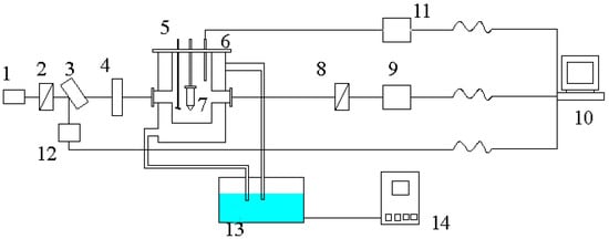 Schematic of the set-up for situ measurement of growth rate. 1: He-Ne laser; 2: Polarizer; 3: Beam splitter; 4: Diaphragm; 5: Stirrer; 6: Thermocouple; 7: Crystal; 8: Analyzer; 9: Photocell; 10: Computer; 11: AI-708P temperature controller; 12: Photocell; 13: Thermostatic vessel; 14: FP21 temperature controller.