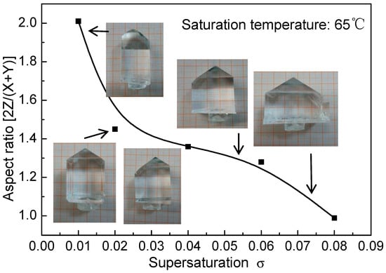 The material objects grown at different supersaturation and their aspect ratio are shown in Figure 2. The aspect ratio were calculated by 2Z/(X + Y), the length were measured by Vernier caliper. It can be seen that the crystals grown at σ = 0.01~0.06 had a good optical transparency and no obvious macro defects by naked eye. The aspect ratio of the crystals decreased with the rise of supersaturation. Variations of supersaturation caused considerable shape change. At low supersaturation, the crystal was a “tall and thin” shape. At high supersaturation, the shape became “chunky” finally.
