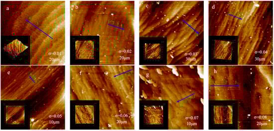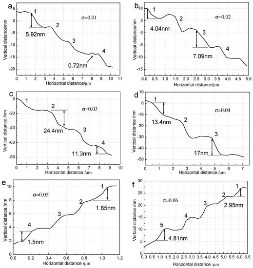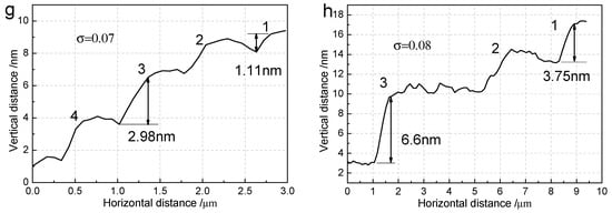 Step height and width measured according to AFM images. (a) σ = 0.01; (b) σ = 0.02; (c) σ = 0.03; (d) σ = 0.04; (e) σ = 0.05; (f) σ = 0.06; (g) σ = 0.07; (h) σ = 0.08.