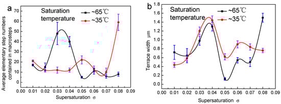 (a) Average elementary step numbers contained in macrosteps, (b) terrace width, and (c) step slope depend on the supersaturation at different saturation temperatures of 65 °C and 35 °C.