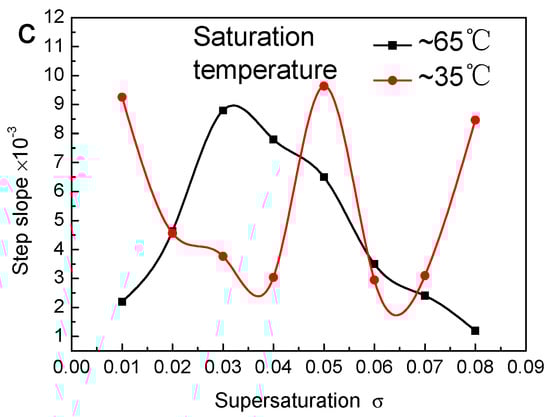 The step slope first increased then decreased with the rise of supersaturation when the saturation temperature was around 65 °C. The step slope had a peak at σ = 0.03 to σ = 0.04, which was consistent with the apex of step bunching. The peak position was at σ = 0.05 when the temperature was around 35 °C. The step slope was synchronized with step bunching at these peaks. For σ = 0.01 and σ = 0.08, the slope of the crystal grown around 65 °C was very low, which was different from the situation around 35 °C.