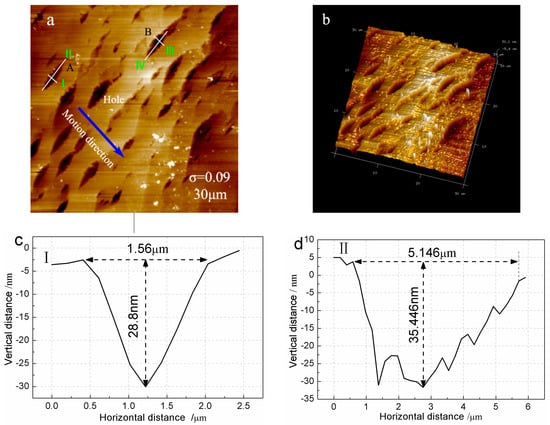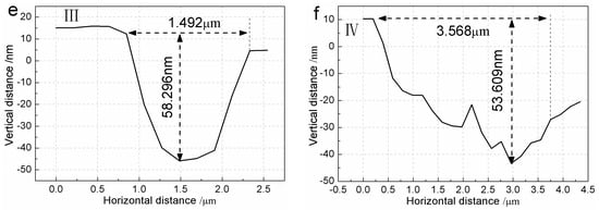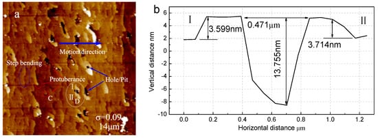 The structure along the line from I to II at the position “D” was measured, the information is shown in Figure 7b. It can be seen that the top of the two protuberances were both flat. At the end of “I”, the height between the protuberance with the step terrace on the bottom was about 3.559 nm. At the end of “II”, the height was about 3.714 nm. In addition, the width and height of the pit were about 0.471 μm and 13.755 nm, respectively.