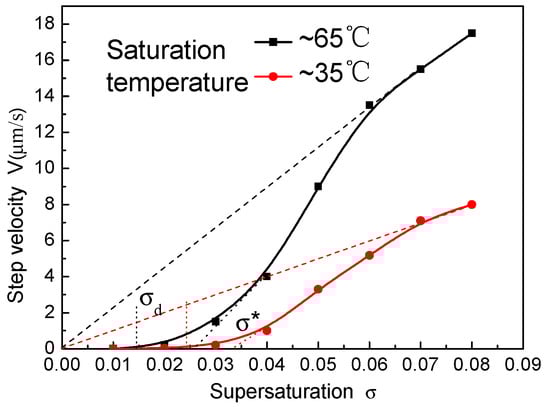 The supersaturation dead zone σd and linear region σ* around 65 °C were both less than the values around 35 °C. As shown in Figure 8, the dependence v(σ) became a straight line passing through the origin [19] at σ = 0.06 around 65 °C and at σ = 0.07 around 35 °C. The three values of the supersaturation dead zone σd, linear region σ*, and the critical supersaturation linearly passing through the origin all reduced with the rise of saturation temperature.