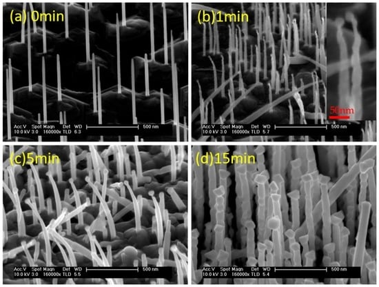 Figure 1 shows scanning electron microscopy (SEM) images taken from four samples with different deposition times of GaSb, among which images of pure GaAs NWs were taken for comparison to understand the growth of GaSb shells. As can be seen from Figure 1a, vertical GaAs NWs with a high density are observed with consistent morphology and orientation. They are 700–800 nm in length, with diameters ranging from 30–50 nm. Additionally, slight tapering can be clearly witnessed, especially in the bottom region, suggesting that lateral growth occurred [31,32]. Figure 1b is a side view SEM image of grown GaAs/GaSb NWs with a 1 min growth time of GaSb. The insert is a magnified SEM image of typical NWs, showing rugged sidewalls and evident particles on NW tips, compared with GaAs NWs in Figure 1a.