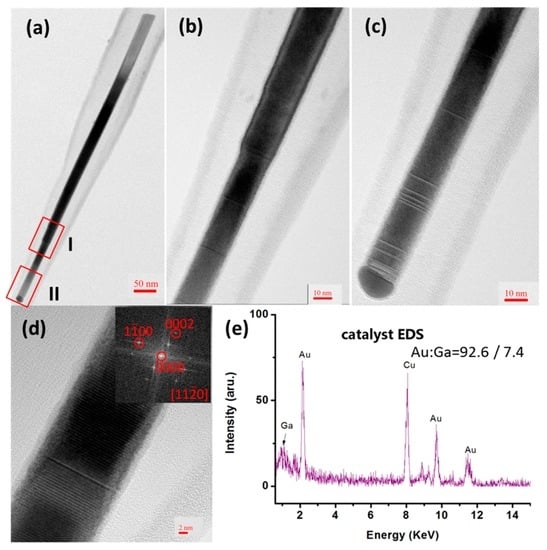 To understand detailed structural characteristics of the grown NWs, TEM investigations were performed. Figure 2a shows a bright-field transmission electron microscopy (TEM) image of a typical GaAs NW. Figure 2b,c are magnified TEM images taken from top of the NW, corresponding to the red regions in Figure 2a respectively, where the slight tapering caused by lateral growth is consistent with the SEM image shown in Figure 1a. Some planar defects can be seen in these magnified TEM images. Figure 2d is the high-resolution TEM image of the NW and the insert is the Fast Fourier Transform (FFT) result, from which the grown GaAs NWs possess wurzite structure. To understand the composition of the catalyst, energy dispersive spectroscopy (EDS) analysis was carried out and the result is shown in Figure 2e, in which the catalyst contains Au and Ga. Further quantitative EDS analysis shows that the Ga concentration in the catalyst is 7.4 at. %. Our extensive TEM observations match perfectly with previous reports that NW structure can be tuned by catalyst composition. Zhang et al. claimed that defect-free wurzite structure GaAs NWs can be acquired with a high Ga supersaturation in catalysts (~10%), while massive intermixing defects appear when the Ga concentration is only about 1% [34]. This explains our GaAs NW with few planar defects.