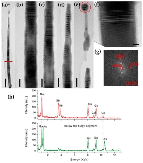 - Shi, S.X.; Zhang, Z.; Lu, Z.Y.; Shu, H.B.; Chen, P.P.; Li, N.; Zou, J.; Lu, W. Evolution of morphology and microstructure of GaAs/GaSb nanowire heterostructures. Nanoscale Res. Lett. 2015, 10, 108. [Google Scholar] [CrossRef] [PubMed]