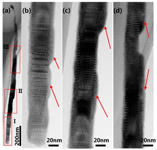 TEM characterizations of the GaAs/GaSb NW. (a) A bright-field TEM image of a typical GaAs/GaSb NW with 5 min growth time. (b–d) are high magnification images corresponding to I, II, III, as shown in (a), respectively. Scale bars are 200 nm in (a), 20 nm in (b–d).