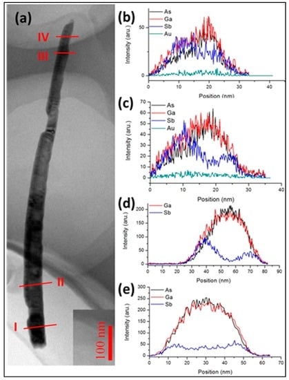 (a) A bright-field TEM image of GaAs/GaSb NW with 5 min growth time. (b–e) EDS line scan results corresponding to the GaAs/GaSb NW from top to bottom respectively, as indicated by the red line. Scale bar is 100 nm in (a).