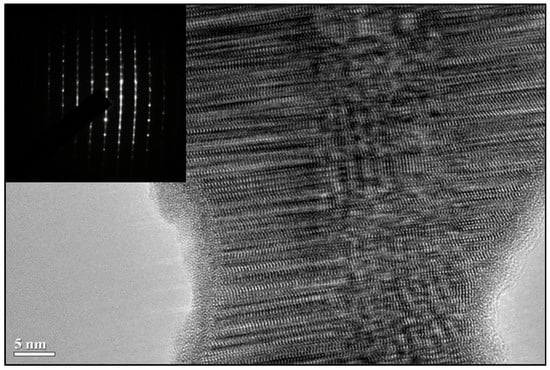 As for former samples, the shell layers’ crystal structure cannot be easily determined because of their short growth time. Thus, detailed TEM characterization was carried out on NWs with 15 min growth time of the GaSb section. Figure 6 is a high-resolution TEM image taken from a section of the core-shell region, in which a high density of lattice defects can be observed because of a large lattice mismatch (up to 7.5%) between GaAs and GaSb. According to the TEM image and the insert selective area electron diffraction (SAED) pattern taken from the shell region, the shell region can be determined to be a wurzite-dominant structure.
