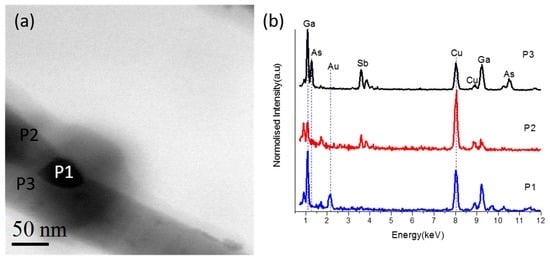 In addition, since we have confirmed the formation of GaSb particles on NW tips, the locations of the Au catalyst droplets should be determined. As it can be seen from Figure 5b,c, the Au can barely be detected. Although detailed EDS analysis was performed on over a dozen of the core-shell NWs, in some cases a small particle was found in the side walls of the GaAs/GaSb NWs. Figure 7 shows an example. In Figure 7a, the particle marked by P1 shows distinct image contrast against other areas close-by, marked by P2 and P3, which were taken from sidewall and middle region, respectively, and placed close to the P1 position for better comparison. The particle was verified by EDS in Figure 7b, and this evidently illustrated that Au particles move downward during the GaSb growth. We account for this movement of Au particles in terms of growth kinetics, since the interfacial energy of Au-GaAs is different with Au-GaSb, which could interrupt the equilibrium of crystallization when Sb atoms entered into the Au particle, leading to the different morphology [16].