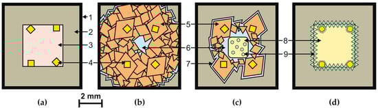 General schemes of crystallization of diamond and silicon carbide in the Mg-Si-C system. (a) Initial sample assembly; (b) Crystallization of diamond; (c) Crystallization of diamond and silicon carbide; (d) Crystallization of silicon carbide. 1—molybdenum; 2—graphite capsule; 3—powder mixture of Mg and Si; 4—diamond seed crystals; 5—crystallized diamond; 6—magnesium-rich melt; 7—magnesium-rich melt film; 8—silicon-rich or silicon melt; 9—crystallized silicon carbide.