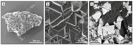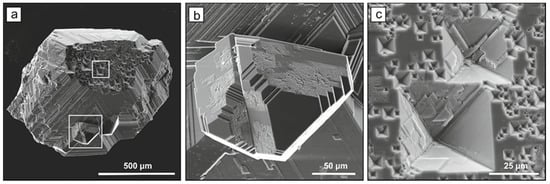 The results of this study also enable us to consider the effect of silicon on the morphology of diamond crystallized in the Mg-Si-C system. As shown previously [11], diamonds with cubic morphology, sometimes having minor {111} faces, form in the Mg-C system at 7 GPa and 1800 °C. The {100} faces are characterized by strong rectangular growth layers, the ends of which are formed exclusively by the {111} faces. Adding 1 wt % silicon leads to a rapid change in the macro- and micromorphology. Cubic morphology transforms to cube-octahedral (Figure 2a,b). Macrolayers on the {100} faces disappear. The surface relief of the {100} faces is determined by plane mirror-smooth {100} areas and numerous pyramidal pits formed exclusively by the {111} microfaces. The growth nature of the pits is confirmed by the distinct growth layers on the bounding {111} microfaces (Figure 2c). On the {111} faces of cube-octahedral crystals, macrolayers parallel to the face edges form. The ends of these layers are bound by the {111} microfaces (Figure 2a). At 2 wt % Si, the cubic faces become minor faces, but they still show plane {100} regions, small octahedral pits and very large depressions formed by the {111} faces (Figure 3a,c). The octahedral faces predominate. They exhibit pronounced macrolayers with the ends built up by the {111} faces (Figure 3b). As a result, the crystals attain a polycentric structure of the {111} faces. Figure 3 also shows that the number of macrolayer generation centers can be significantly different on different faces of the same crystal. Thus, even small changes in the Si content in the system result in substantial changes in the relative growth rates of {100} and {111} faces. Obviously, the growth rate of octahedral faces decreases relative to the growth rate of cubic faces. We may suppose that this process is accompanied by the impurity blocking of some defects on the {100} faces, which leads to the formation of numerous pyramidal growth pits. Therefore, in the Mg-C system, the morphology variation in the cube-octahedron series is unambiguously determined by the influence of silicon additive. This is in contrast to the conventional transition metal catalysts, where the cube-to-octahedron transformation of the diamond morphology is primarily determined by the P-T parameters of synthesis.