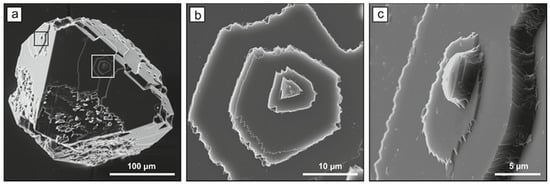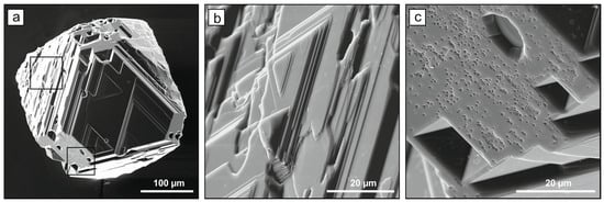 SEM micrographs of a diamond crystal synthesized in the Mg98Si2-C system. (a) General view of the crystal showing dominant {111} faces and minor {100} faces; (b) Growth layers on the {111} face; (c) Growth pits on the {100} face; (b,c)—Enlarged views of areas marked with squares in (a).