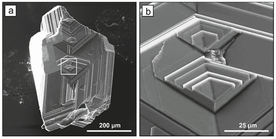 - Khokhryakov, A.F.; Nechaev, D.V.; Palyanov, Y.N. Unusual growth macrolayers on {100} faces of diamond crystals from magnesium-based systems. J. Cryst. Growth 2016, 455, 76–82. [Google Scholar] [CrossRef]